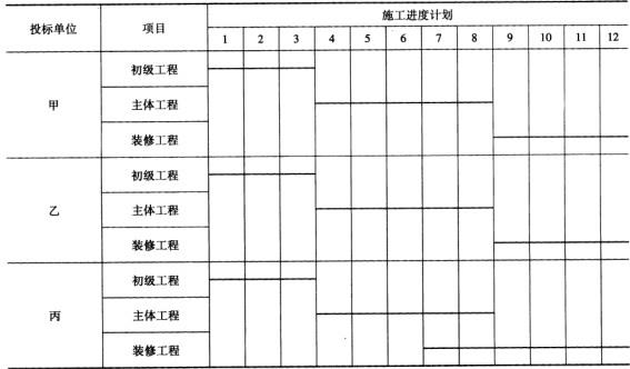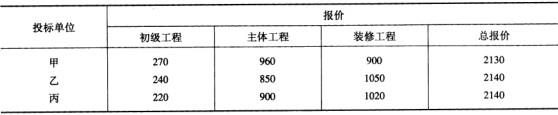 某工程项目采用邀请招标的方式,邀请了甲、乙、丙三家施工单位进行投标竞争。各投标单位的报价如表4-7 -42所示。该工程包括初级工程、主体工程、装修工程三部分,各施工单位施工进度计划安排如表4 -7-43所示。假设工程每月完成的工作量相等,并且施工单位能按月收到工程款。同时假设折现点为工程的开工日期,贷款月利率为1%。