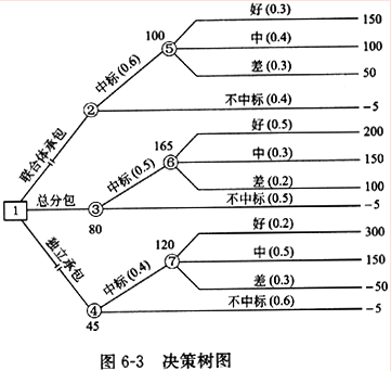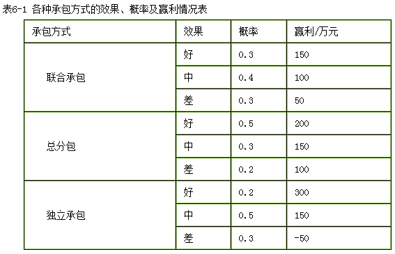 某安装公司决定参与该项目投标。经分析,在其他条件(如报价、工期等)相同的情况下,上述评标标准使得三种承包方式的中标概率分别为0.6、0.5、0.4;另经分析,三种承包方式的效果、概率和盈利情况见表1-1。编制投标文件的费用均为5万元。