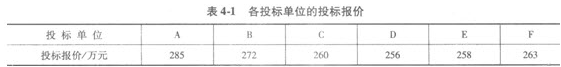 某工程项目,按照招标文件的要求,编制出工程标底价为270万元。开标时先判断各投标单位的投标报价在工程标底价±5010范围内为有效标书,评标时以[(工程报价-实施标底价)/实施标底价的绝对值]最小的为中标单位,实施标底价为有效投标报价的平均值,各投标单位的投标报价见表4-1。