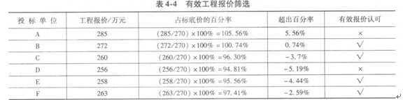 (1)根据下列工程报价资料以及必须在标底价±5010以内的规定,筛选有效工程报价见表4-4。