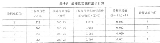 (3)计算最接近实施标底的工程报价顺序。计算出最接近实施标底价的工程报价顺序见表4-5。