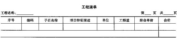 (2)工程量清单表中,一般应包括序号、编码、子目名称、项目特征描述、计量单位、综合单价、合价与备注等内容,见下表。
