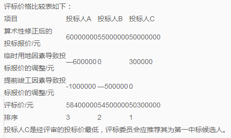 (1)临时用地因素的调整:投标人A:(400-500)*6000=-600000(元);投标人B:(500-500)*6000=0(元);投标人C:(550-500)*6000=300000(元)。