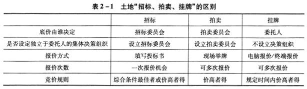 解析 土地“招标、拍卖、挂牌”的区别如表2-1所示。