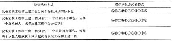问题 某炼油化工设备装置安装工程及其配套的土建工程施工招标承包,项目业主要求招标代理机构提供三种不同的招标承包方式,并说明每种方式的特点,以供业主决策。招标代理机构提出了如下三种招标承包方式: ①设备安装工程和土建工程分两个标段分别招标承包; ②设备安装和土建工程合并一个标段招标承包,选择一个总承包人,或将土建工程作为分包项目; ③设备安装和土建工程合并一个标段招标承包,选择两个承包人组成联合体承包设备安装工程和土建工程。 上述三种招标承包方式可能具有以下不同的特点: A:招标人对应两个签约人; B:招标人对应一个签约人; C:两个承包人分别承担设备安装和土建工程施工及其相关责任; D:两个承包人共同和分别承担设备安装和土建工程施工及其相关责任; E:一个承包人承担全部建筑安装工程施工及其相关责任; F:有利于承包人系统管理和控制全部建筑安装工程的质量、进度、造价和安全; G:不利于系统控制和衔接全部建筑安装工程施工质量、进度、造价和安全; H:招标人的招标和工程管理工作量比较大; I:招标人的招标和工程管理工作量比较小; J:招标人需待设备安装和土建工程施工图设计全部完成后才能组织施工招标; K:招标人可以结合设计完成条件和工程进度需要优先组织关键工程施工招标。[2011年真题] 【问题】 分别说明三种招标承包方式各自的特点。 作答要求: 在专用答题卡表格相应栏目内,将题干中表示所选招标承包方式特点的字母用2B铅笔 在表4 -5中涂黑(同一字母可以出现在不同的栏目中,错选,不得分;少选,得部分分)。
