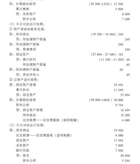 问题 股权投资的核算   A集团公司与其子公司B公司作为发起人,联合C公司等三家发起设立D股份公司。注册资本50 000万元,经批准于2010年12月20日注册登记。A公司以其专利权投资,占25%的份额;B公司以其所属的独立核算的分公司资产作为出资投入股份公司,占60%的份额,C公司占15%的份额。评估基准日为2010年8月31日,有关资产、负债的评估价值如下表所示:  要求:   (1)根据上述资料对A公司投资进行账务处理。   (2)根据上述资料对B公司财产清查、资产评估、投资进行账务处理。   (3)根据上述资料对D公司进行账务处理。