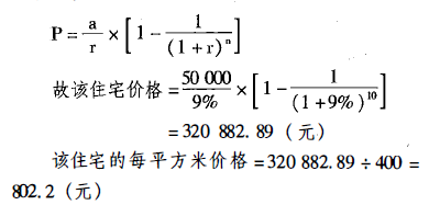某砖混结构的三层住宅,宅基地面积为180平方米,建筑面积为400平方米。该房地产的折现率为9%,评估时的剩余使用年限为10年二经测算,该住宅的年纯收益为5...