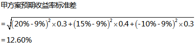 解析 (1)预期收益率的期望值:   甲方案收益率的期望值=20%×0.3+15%×0.4+(-10%)×0.3=9%   (2)预期收益率的标准差: (3)预期收益率的变异系数:   甲方案预期收益率变异系数=12.60%/9%=1.40