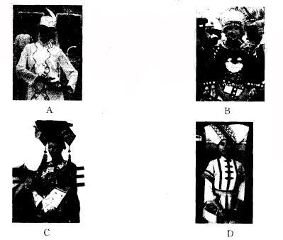 解析 从图中服饰的特点可以看出,A项是回族的服饰,B项是苗族的服饰,C项是满族的服饰,D项是壮族的服饰。