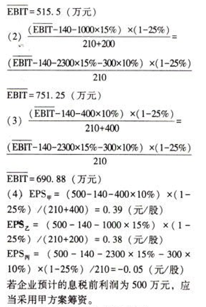 (5)当企业预计的息税前利润小于515.5 万元时应采用甲方案,当企业预计的息税前利润大于515.5万元但小于751.25万元时应采用乙方案,当企业预计的息税前利润大于751.25万元时应采用丙方案。