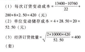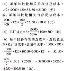 问题 上海东方公司是亚洲地区的玻璃套装门分销商,套装门在A地区生产然后运至上海。管理当局预计年度需求量为10000套。套装门购进单价为395元(包括运费,币种是人民币,下同)。订购和储存套装门的相关资料如下。 (1)去年订单共22份,总处理成本13400元,其中固定成本10760元,预计未来成本性态不变。 (2)虽然对于A地区原产地商品进入大陆已经免除关税,但是对于每一张订单都要经双方海关检查,其费用为280元。 (3)套装门从A地区运抵上海后,接收部门要进行检查。为此雇佣一名检验人员,每月支付工资3000元,每个订单检验工作需要8小时,发生变动费用每小时2.50元。 (4)公司租借仓库来储存套装门,估计成本为每年2500元,另外加上每套门4元。 (5)在储存过程中会出现破损,估计破损成本为平均每套门28.50元。(6)占用资金应计利息等其他储存成本为每套门20元。 (7)从发出订单到货物运到上海需要6个工作日。 (8)为防止供货中断,东方公司设置了100套的保险储备。 (9)东方公司每年营业50周,每周营业6天。 (10)假设企业没有缺货成本。 要求: (1)计算经济订货模型中“每次订货变动成本”。 (2)计算经济订货模型中“单位变动储存成本”。 (3)计算经济订货批量。 (4)计算每年与批量相关的存货总成本。 (5)计算再订货点。 (6)计算每年储备存货的总成本。