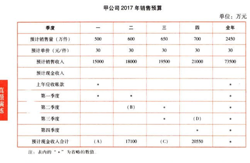 解析 1)A=16500;B=12600;C=19050;D=5850。 (2)2017年年末预计应收账款余额= 21000×30%=6300(万元)。 解析: A=15000×70%+6000=16500(万元)B=18000×70%=12600(万元) C=19500×70%+18000×30%=19050(万元)D=19500×30%=5850(万元)。