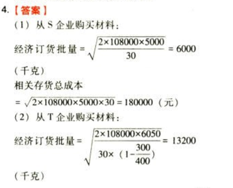 问题 丙公司是一家设备制造企业,每年需要购某材料108000千克,现有S和T两家符合要求的材料供应企业,他们所提供的材料质量和价格都相同。公司计划从两家企业中选择一家作为供应商。相关数据如下。 (1)从S企业购买该材料,一次性入库。 每次订货费用为5000元,年单位材料变动储存成本为30元/千克。假设不存在缺货。 (2)从T企业购买该材料,每次订货费用为6050元,年单位材料变动储存成本为30元/千克。材料陆续到货并使用,每日送货量为400千克,每日耗用量为300千克。要求: (1)利用经济订货基本模型。计算从S企业购买材料的经济订货批量和相关存货总成本。 (2)利用经济订货扩展模型。计算从T企业购买材料的经济订货批量和相关存货总成本。 (3)基于成本最优原则。判断丙公司应该选择哪家企业作为供应商。(2017年卷1)