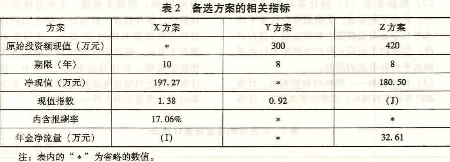 资料三:Y方案需要投资固定资产300万元,不需要安装就可以使用,预计使用寿命为8年,期满无残值。预计每年营业现金净流量为50万元,经测算,当折现率为6%时,该方案的净现值为10. 49万元,当折现率为8%时,该方案的净现值为-12.67万元。 资料四: Z方案与X方案、Y方案的相关指标如表2所示。