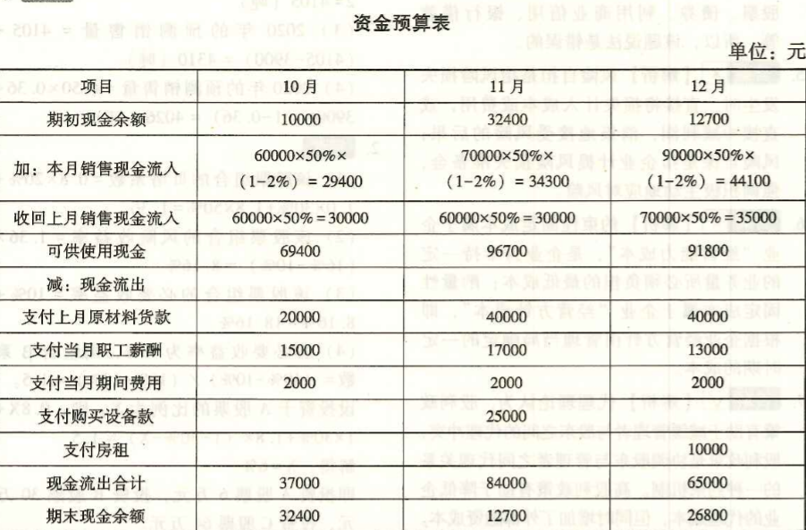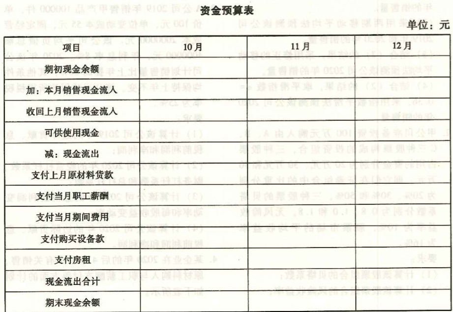 假设所有的销售都是除销。50%的应收账款将在销售的当月内收回,但要提供2%的现金折扣。其余的50%将在下个月收回。企业通常在购买原材料之后的下个月支付货款,但所有的职工薪酬都在当月支付。假设还有以下情况发生: (1)每个季度的房租为10000元,在每个季度末支付。 (2)每个月要支付2000元的其它期间费用。 (3)11月份支付9月份购买设备的应付账款25000元。 (4)10月1日企业计划保持的现金余额为10000元。 (5)假设该企业每月期末现金余额控制范围在10000~35000元。 要求:编制该企业2020年10~12月的资金预算表。(完成给定表格)