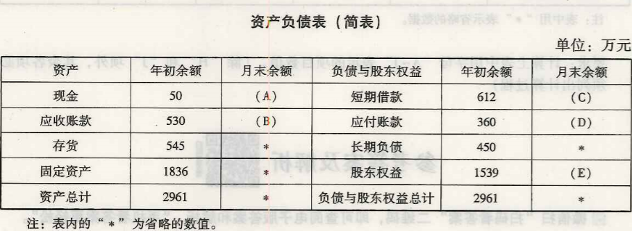 解析 A=50;B=620;C=632;D=450;E=1629。 【解析】 (1)公司的目标现金余额为50万元,则A=50万元 (2)B=650×80%+1000×10%=620(万元) (3)3月份新增短期借款=50-30=20(万元),则C=612+20=632(万元)(4)D=750×60%=450(万元) (5)E=1539+90=1629(万元)。
