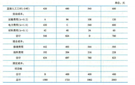 要求: (1)计算表中用字母表示的项目。 (2)如果8月份的实际业务量为500小时,计算: ①变动总成本预算数; ②固定总成本预算数; ③修理费用和油料费用预算数; ④制造费用预算数。