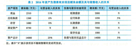 资料二:甲公司2016年末资产负债表有关项目余额及其与营业收入的关系如表2所示: