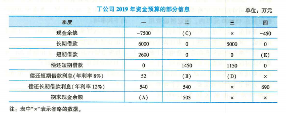 解析 A=508;B=52;C=2545;D=23;E =1700 【解析】A=-7500+6000+2600-52-540=508 B=2600×8%/4=52 C-1450-52-540=503,得出C=503+54052+1450=2545。 D=(2600-1450)×8%/4=23 -450+E-690-Ex8%/4≥500, 得出E≥1673.47, 所以E=1700。 ①关于B,本题已经说明了利息支付方式 所以不能默认为是利随本清,而是将所有短期借款利息分摊到各季度,由于1450万元是第二季度末归还的,所以第二季度应该支付期初借款2600万元在一个季度产生的利息,也就是与第一季度利息相同。 ②关于D,1150万元是第三季度末归还的,所以在第三季度还要计算利息,即要计算第三季度初短期借款(2600-1450)在一个季度产生的利息。