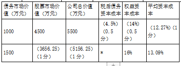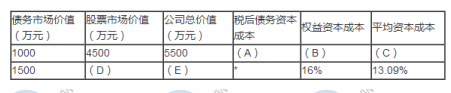 说明: A=6%×(1-25%)=4.5% B=4%+1.25×(12%-4%)=14% C=4.5%×(1000/5500)+14%×(4500/5500) =12.27% D=(900-1500×8%)×(1-25%)/16%=3656.25 E=1500+3656.25=5156.25(2)【正确答案】债务市场价值为1000万元时,平均资本成本最低,公司总价值最大,所以债务市场价值为1000万元时的资本结构更优。(1分)