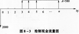 解析 依据《造价管理教材》第四章第一节内容,应选D项。 绘制现金流量图如图8—3所示。 年初总投资额在建设期期末终值F=2000(1+10%)2=2420万元 根据等额现金流量计算,等额系列现值系数(P/A,i,n)为: 2420=580(P/A,10%,n-2),则:(P/A,10%,n-2)=2420/580=4.1724 由已知条件.采用内插法求n: n-2=5+(6-5)*(4.1724-3.7908)/(4.3553-3.7908) 解之得:n=7.676年