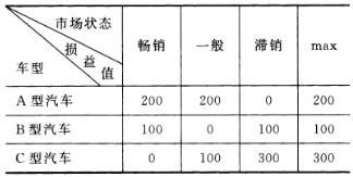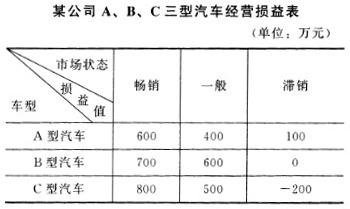问题 共用题干某跨国汽车公司1997年进入中国市场,业务范围不断扩大,不仅在汽车制造领域站稳脚跟,而且通过并购、联合等多种形式,使业务遍及家电、医药、建筑等多个领域。在汽车制造领域,该公司业绩表现尤为突出,不断针对不同类型人群,推出具有独特功能和款式的新型号汽车,占领不同领域消费市场,市场占有率大幅提升。今年该公司拟推出一款新功能车型,备选车型共有A、B、C三种。未来市场状况存在畅销、一般和滞销三种可能,但各种情况发生的概率难以测算。在市场调查的基础上,公司对三种型号汽车的损益状况进行了预测,在不同市场状态下的损益值如下表所示: 根据以上资料,回答下列问题: