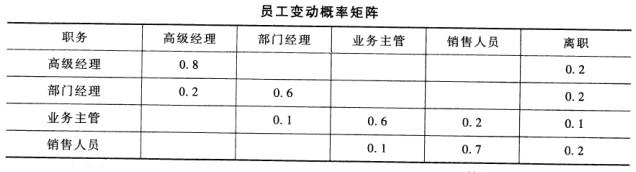 共用题干某企业的高级经理、部门经理、业务主管和销售人员四类岗位年初员工数量分别为10人、20人、40人和80人。年内这四类岗位员工的变动概率如下:...