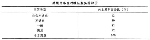 问题 某社区服务满意研究中,调查人员在某居民小区抽样调查100户,得到下表所列调查结果,其中回答“满意”的占()。