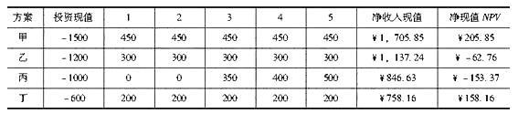 解析 四个方案投资净现值比较如表2所示。 表2 由表2可知,乙和丙净现值都为负,不可行。