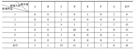 问题 航空运输服务部门某一生产岗位共有职工7人,在工作中常出现的差错类型共有6种,7人在半年内所出的各种类型的差错总数共41次。经认真分析,发现每个人所出的差错均有不同的表现特征。每人所出现的不同类型的差错次数见下列的差错矩阵表。 操作者C所出的各种类型的差错很可能属于(  )。