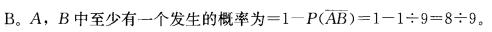 设随机事件A、B相互独立,其发生概率均为2/3,则A, B中至少有一个发生的概率为( )。A. 1 B. 8/9C. 4/9 D. 1/9