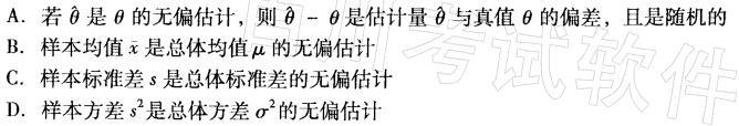 解析 样本标准差s不是总体标准差的无偏估计,因为总有E(s) ≠σ,所以s是σ的有偏估计。