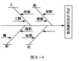 问题 某车间为了提高产品合格率,由几名技术人员和工人组成一个QC小组。组长负责激发员工全员参与的积极性,对改善成果的最终确认;副组长全面指导质量管理小组工作;组员负责资源提供和成果评审。QC小组以当家做主、质量第一、循序渐进和统计学为指导思想进行活动。 有个组员先绘制了一张因果图,如图8-4所示,大家讨论后发现该图存在问题,具体是( )。 A.包括了两个问题 B. “人、机、料、法、环”不全 C.没有进一步向下一层次展开 D.文字描述太笼统