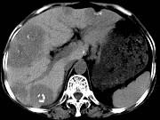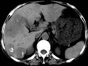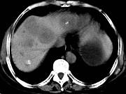 女,55岁,腹胀,肛门闭气,消瘦乏力,肝区疼痛,CT检查如图,最可能的诊断为()A.多发性肝脓肿B.肝癌肝内转移C.肝淋巴管瘤D....