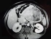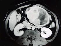 男,36岁,腹胀、消化不良、消瘦、中上腹痛,影像检查如下图,最可能的诊断是()A.胃间质肉瘤并肝转移B.胃间质瘤并原发性肝癌C.内...