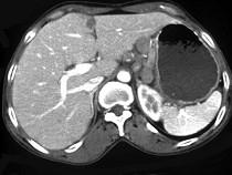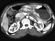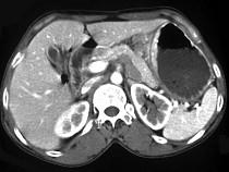 问题 女,56岁,上腹部钝痛、腹胀不适1月余,纳差、消瘦,影像检查如图,最可能的诊断是()