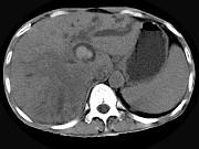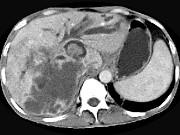 问题 男,44岁,右上腹痛半年,腹部未触及包块,轻度黄疸,AFP阴性,CT检查如图,最可能的诊断为()