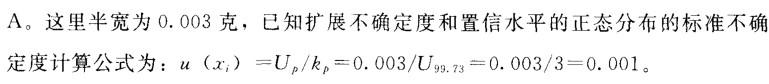 问题 已知某砝码质量的测量结果为m=(99. 981±0.003) g,若置信概率为0.997 3 则该砝码质量测量的标准不确定度为( )。 A. 0. 001 g B. 0. 001 5 g C. 0. 0017 g D. 0. 003 g
