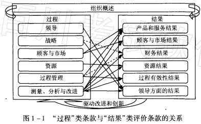 “过程”类条款与“结果”类评分条款的关系框图显示了过程类目与结果类目的评分项之间的较为直接的对应关系,其中,过程类条款中“领导”对应的结果类评分条款 是(...