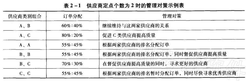 解析 对各类供应商的管理可以结合企业的供应商定点个数来区别对待。对于供应商定 点个数为2的情况,订单分配与管理对策参见表2 - I。