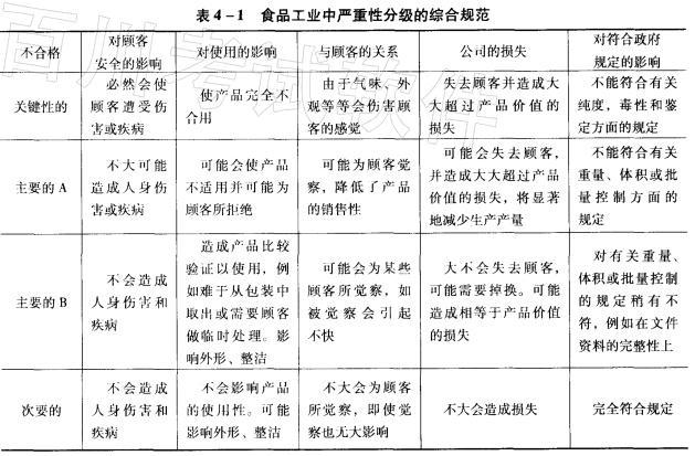 解析 食品工业中严重件分级的综合规范如表4 -I所示。 由表4-I可知,该奶油蛋糕完全不能食用,属于关键性的不合格严重性级别。