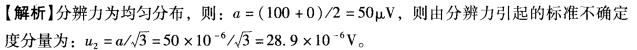问题 对数字多用表的直流电压量程进行检定,按照制造厂规定的办法,由多功能校准器输出10V直流电压加到被校数字多用表,用以检定其20V量程的准确特性。以为多功能校准器 输出的10V电压非常稳定,当加到被校数字多用表上后,数字多用表指示的电压值保持不 变,故记录的读数只有10.0001V。因此,测量结果的A类标准不确定度分量不评定。 数字多用表在20V量程时的分辨力为100μV(即最低为有效数字),则由分辨力引起的标 准不确定度分量为( )。