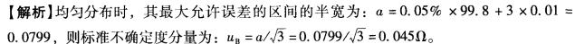 问题 在某电子设备的生产中,需要使用100(1的低值电阻器,设计要求其最大允许误差应在 ±0.1%以内。测量方法是用一台数字多用表对被测电阻器的电阻进行直接测量。已知该数 字多用表经检定合格,且其技术指标如下: 最大允许误差为:± (0. 05% ×读数+3 ×最低位数值); 测量所用档的满量程值为199. 9Ω,最低位数值为0. 01Ω; 当环境温度在(20 ±5)1时,温度的影响可忽略。 在22℃,实测10次,得到的样本均值及=99.8Ω,s(R))=0.25Ω。 标准不确定的B类分量为( )Ω,假设测量值在其最大允许误差的区间内服从均匀分布。 A. 0.045 B. 0.06 C. 0.078 D. 0. 46