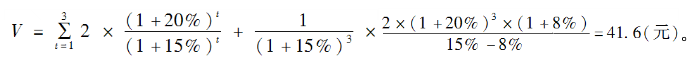 问题 某公司上年年末支付每股股息为2元,预期回报率为15%,未来3年中股息的超常态增长率为20%,随后的增长率为8%,则股票的价值为()元。