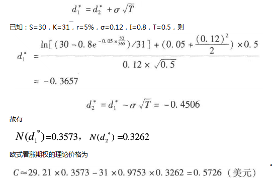 问题 市场中,某股票的股价为30美元/股,股票年波动率为0.12,无风险年利率为5%,预计50天后股票分红0.8美元/股,则6个月后到期,执行价为31美元的欧式看涨期权的理论价格为()美元。