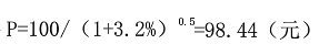 问题 2011年3月1日,中国人民银行发行1年期中央银行票据,每张面值为100元人民币,年贴现率为3.2%。2011年8月31日,年贴现率不变,则其理论价格为()元。