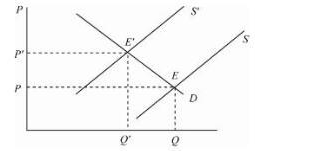 解析 如下图所示的均衡价格模型中,纵轴表示价格,横轴表示需求量和供给量。需求曲线D与供给曲线S相交于E点。在其他条件不变时,如果生产成本上升,利润下降,供给就会减少,供给曲线S向左移动到S~1。