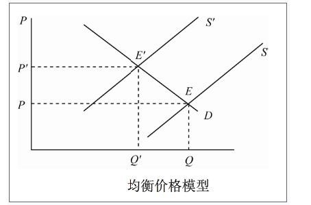 解析 如图所示的均衡价格模型中,纵轴表示价格,横轴表示需求量和供给量。需求曲线D与供给曲线S相交于E点。在其他条件不变时,如果生产成本上升,利润下降,供给就会减少,供给曲线S向左移动到S'.