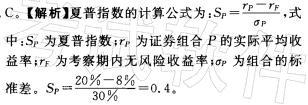 问题 假设投资组合P的实际平均收益率为20%,无风险收益率为8%,该投资组合的标准差为 30%,贝塔值为12%,那么,该投资组合的夏普指数等于( )。 A. 1. 0 B. 0. 6 C. 0. 4 D. 0. 2