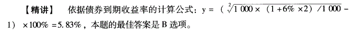 问题 某一次性还本付息债券的面值为1 000元,期限为2年,票面利率为6%,单利计息,按面值发行。该债券的复利到期收益率为( )。 A. 5. 50% B. 5. 83% C. 6. 00% D. 6. 32%